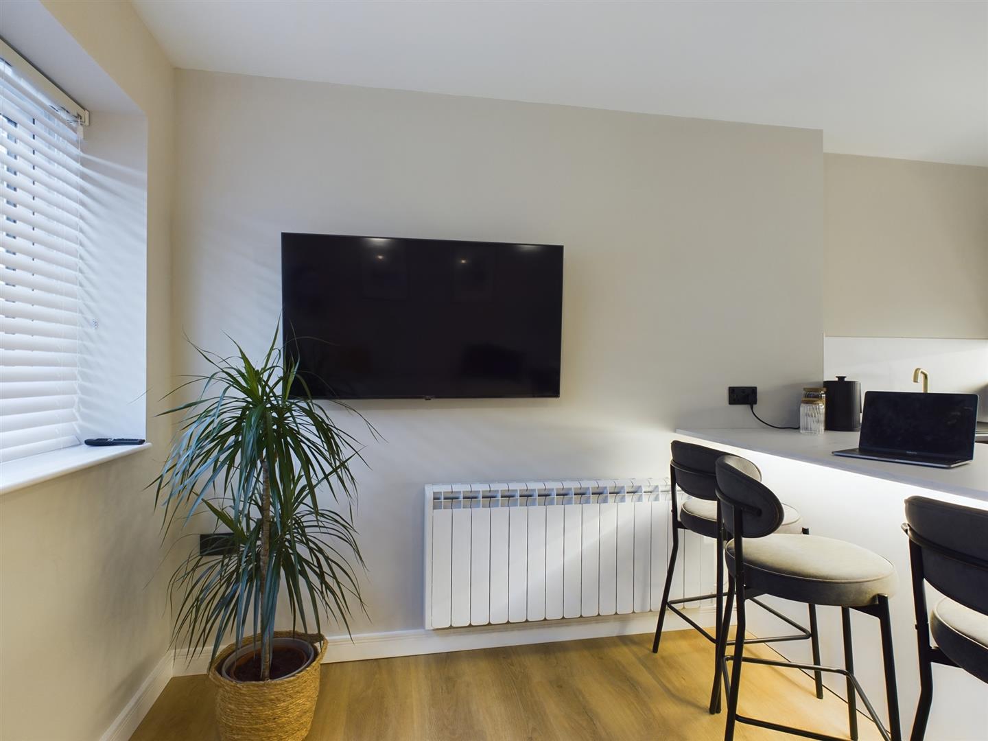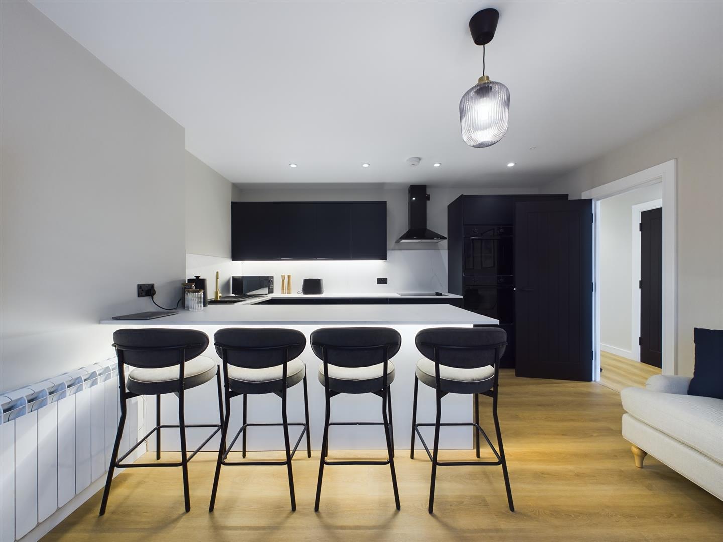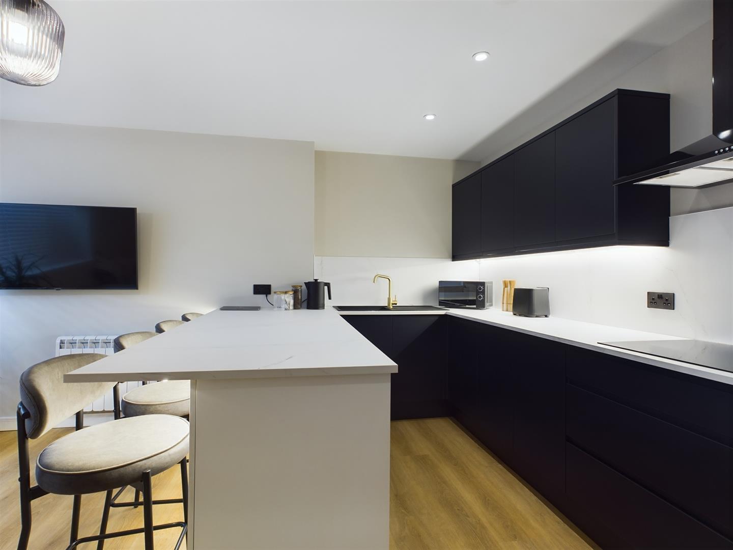 The communal space features a modern kitchen complete with a breakfast bar, ideal for enjoying your morning coffee, and a cosy corner sofa where you can unwind after a long day. The flat-screen TV in the communal area ensures that entertainment is never far away. Appliances supplied of a double oven, hob, Fridge Freezer and two Washer Dryers providing ease and all amenities in mind.